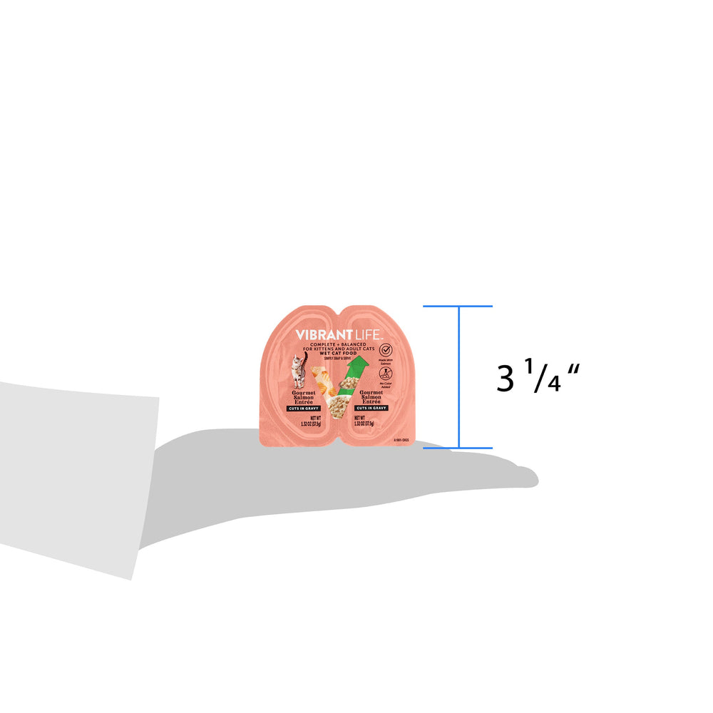 Vibrant Life Gourmet Salmon Entree Cuts in Gravy Wet Cat Food is the purr-fect meal for your feline friend. This split tray of wet cat food for kittens and adults comes with one salmon entree served in savory gravy. In addition, this cat food is grain-free and has no artificial flavors, preservatives or added colors. The easy-to-open tray ensures a fresh meal every time, with the convenience of being able to refrigerate any leftovers. Treat your pet to the delicious taste of Vibrant Life Gourmet Salmon Entree Cuts in Gravy Wet Cat Food.