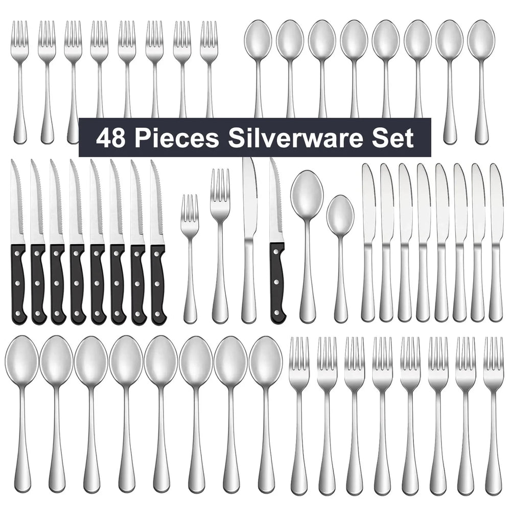 48-piece set includes dinner forks, salad forks, dinner spoons, dessert spoons, dinner knives, and 8 steak knives-perfect for everyday meals or special occasions.  Made from food-grade 410 stainless steel, it offers rust-resistant durability and a sleek, polished finish. The ergonomic design ensures a comfortable, non-slip grip, while its timeless elegance suits any table setting.  Ideal for home use, restaurants, weddings, and parties.