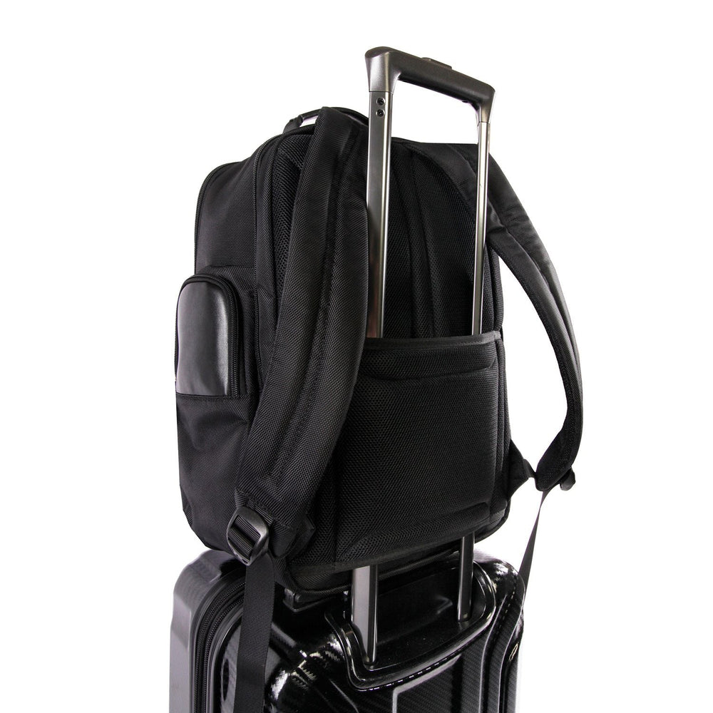 The Ezra backpack can be securely attached to the telescoping handle of any luggage for easy transportation.