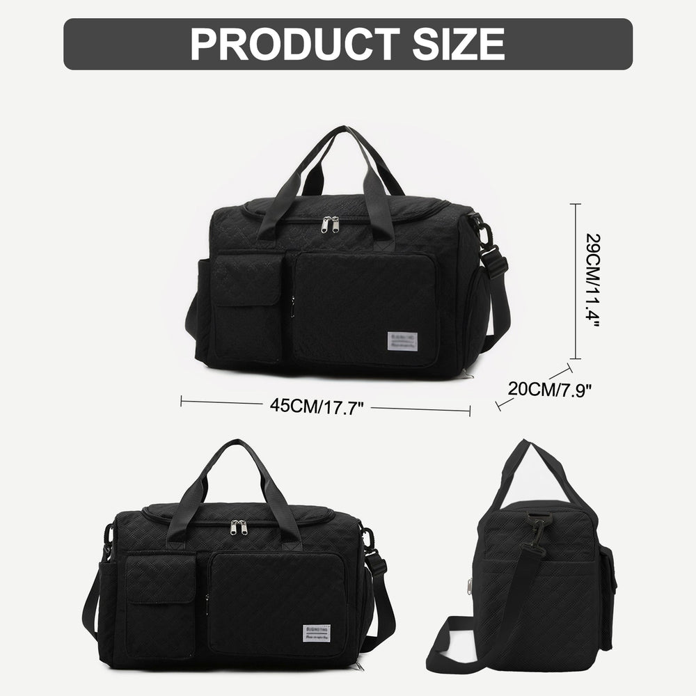 【Large Capacity & Multiple Pockets】: This overnight bag is spaciously designed with multiple pockets to categorize and organize your belongings. The main compartment was designed to hold gym accessories and daily supplies.It also has a shoe compartment and a wet pocket for accommodating sports shoes and wet towel. There are two front pockets and one side pocket, one back pocket, youcan take and bring more carry-on goods or water bottles. Whether you're heading to the gym or going on a weekend getaway, it's got you covered.