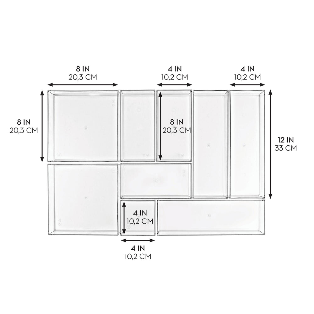 Create a home for every one of your essential items with the iDESIGN 9-Piece Drawer Organizer Set. Nine organizers of varying sizes allow you to group items together, storing everything from makeup to skincare items more efficiently in any standard-sized or deep drawer. Thanks to the clear construction and shallow sides, essentials are always visible and close at hand when you need them most. For efficiency, use this organizer in multiples or stack vertically, allowing you to sort and arrange items by size or use them in any kitchen, bathroom, or desk drawer.