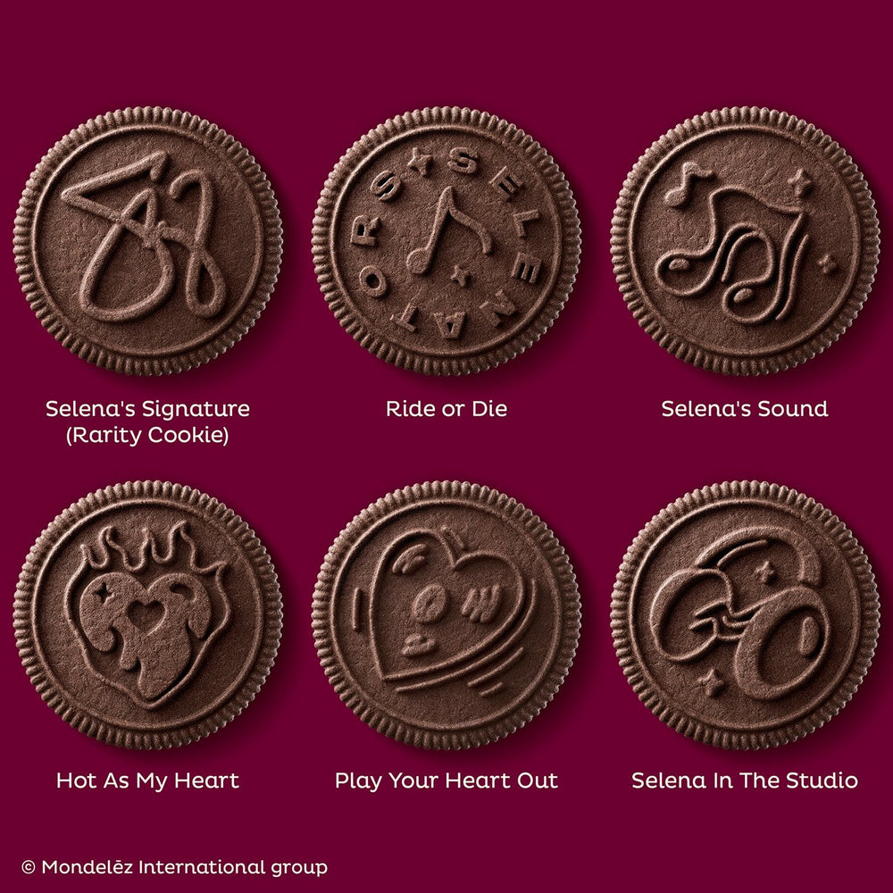 üç™ Selena‚Äôs Signature OREO Cookies ‚Äî Inspired by horchata, these chocolate cinnamon-flavored OREO wafers are filled with two dreamy layers of creme: rich Chocolate & Cinnamon Flavor Creme and Sweetened Condensed Milk Flavor Creme, with Cinnamon Sugar Inclusions. Each cookie is embossed with one of six unique Selena Gomez-inspired designs.