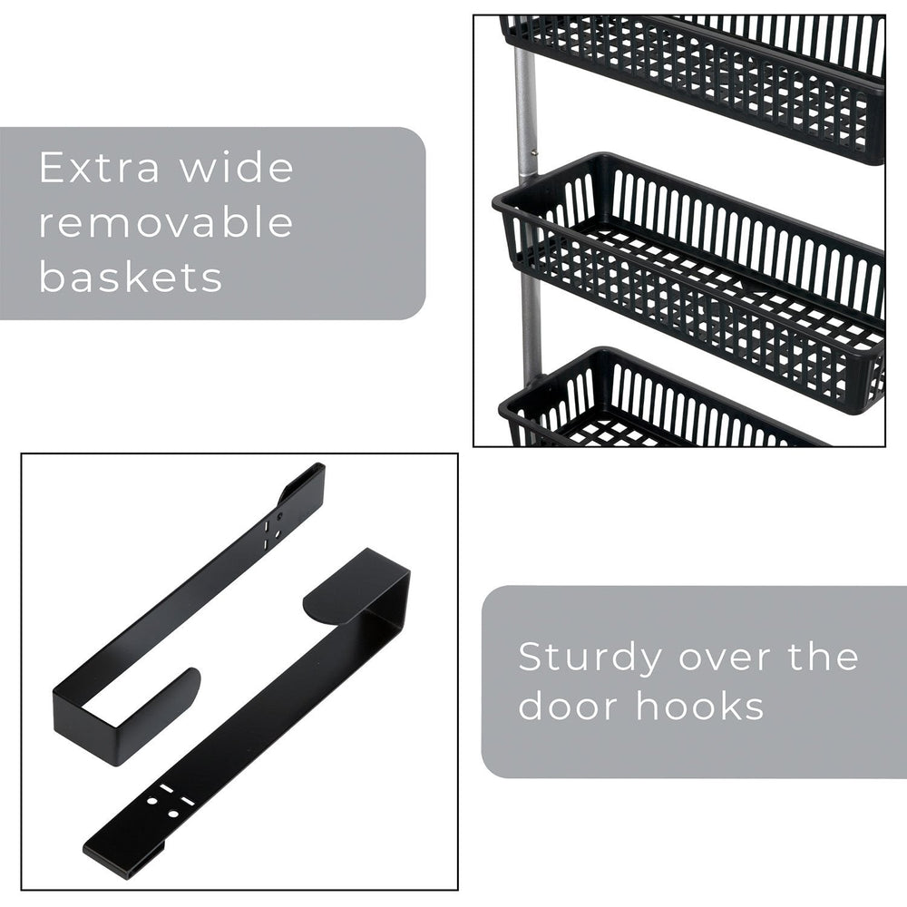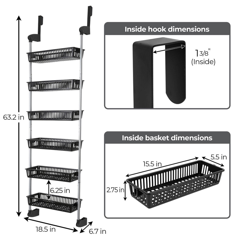 Smart Design Large Over-The-Door 6-Tier Basket Pantry Organizer is quick and easy to setup. Hangs over the door with the sturdy hooks included to fit almost any residential or commercial door. The package includes Smart Design 6-Tier Over-The-Door Pantry Organizer with 6 Baskets and steel hooks for door hanging. New and improved interlocking baskets provide durability and maximum storage for many different household items. Features and Benefits Basket shelving allows you to customize which items are stored in any room in your home. Made from a sturdy steel frame design, and rustproof finish along with resin baskets makes this a great multi-use storage solution.Â