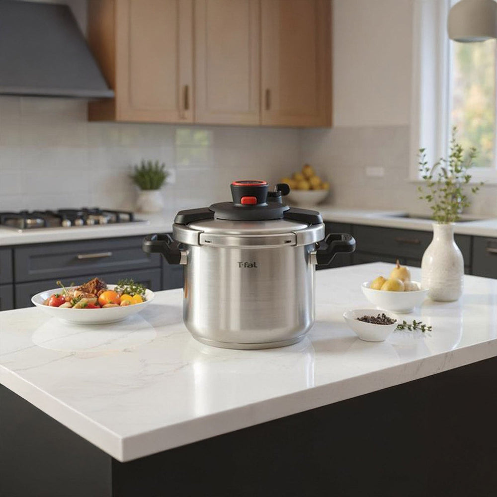 In a fraction of the usual time, prepare healthy, delicious meals with the T-fal Clipso pressure cooker. Compared to standard cooking methods, the pressure cooker reduces cook times by up to 70% for faster results while retaining valuable nutrients and flavor. The cooker’s 8-quart capacity makes it easy to create large batches, whether preparing make-ahead meals for the week or cooking for a crowd during the holidays. The pressure cooker’s durable stainless-steel construction ensures optimal cooking and long-lasting performance, and its encapsulated base distributes heat evenly and can be used safely on any cooktop, including induction. Safety features include an innovative one-hand system for risk-free opening and closing, the inability to open when in use and under pressure, a variable steam-release valve for added control, and side handles for secure carrying. The Clipso stainless-steel pressure cooker can go safely in the dishwasher (with gasket and pressure valve removed), and a steam basket and stand are included for multi-level cooking, along with a recipe book with cooking tips.
